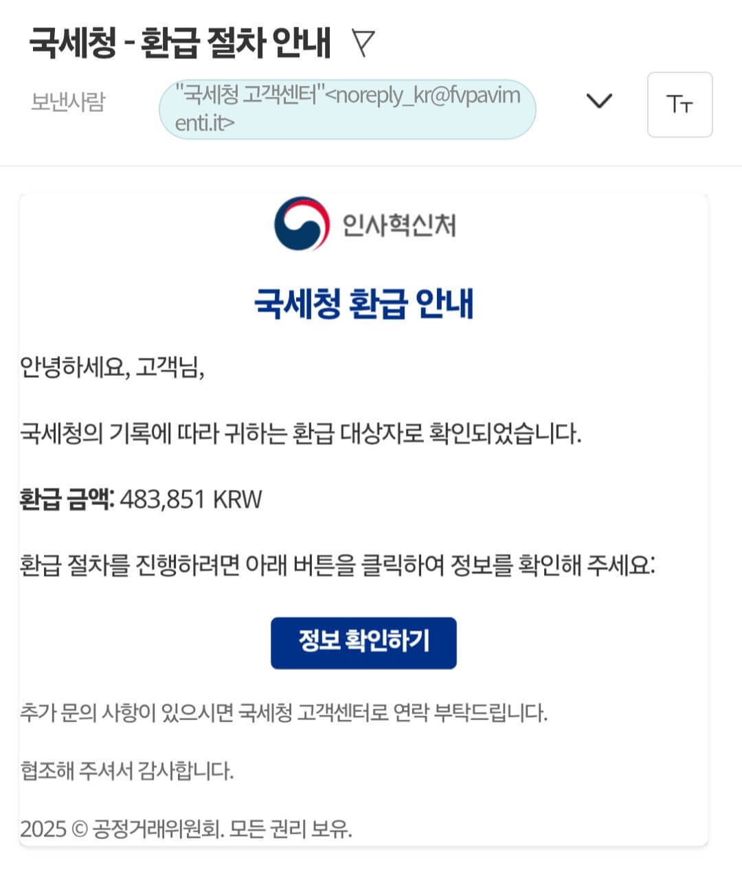최근 국세청 환급 안내 메일을 받은 분들이 많습니다. “세금 환급금이 있으니 지금 바로 신청하세요”라는 문구와 함께 첨부파일이나 링크가 포함된 이 메일, 과연 진짜일까요? 필자도 오늘 이 메일을 받았고, 손택스(국세청 공식 모바일 앱)에 직접 접속해 확인한 결과, 환급금은 없었습니다. 결론은 명확했습니다.