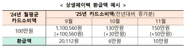 상생페이백의 가장 큰 매력은 바로 이 부분이에요. 2024년 월평균 카드 사용액보다 2025년 9월~11월 사용액이 늘어나면, 그 증가분의 20%를 환급해 주는 거예요. 월 최대 10만원, 3개월간 총 30만원까지 받을 수 있답니다!