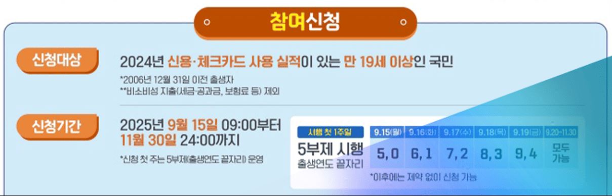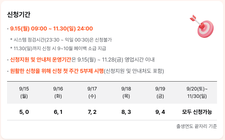 첫 주에는 출생연도 끝자리 기준으로 5부제가 적용되는데요. 9월 15일은 0과 5, 16일은 1과 6, 이런 식으로 나누어서 신청받아요. 하지만 9월 20일부터는 언제든지 신청 가능하니까 크게 걱정하지 마세요!