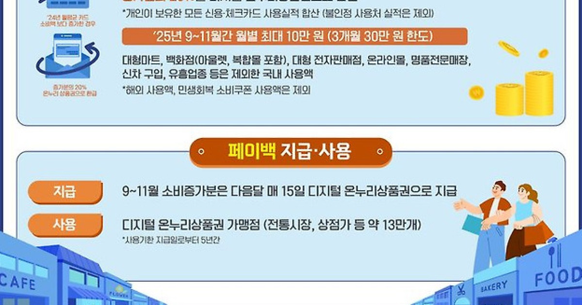 전통시장, 소상공인 매장, 동네 카페나 식당, 소규모 편의점 등에서 신용카드나 체크카드로 결제한 금액이에요. 삼성페이나 애플페이도 포함되고요. 연 매출 30억원이 넘는 곳도 인정된다는 점이 민생회복 소비쿠폰과는 다른 부분이에요!